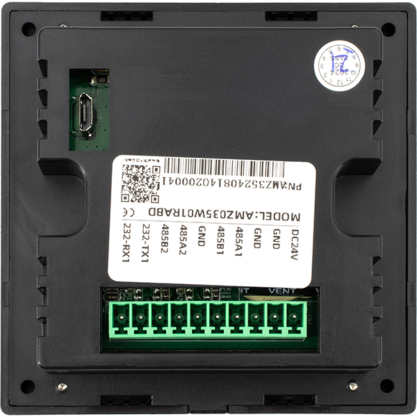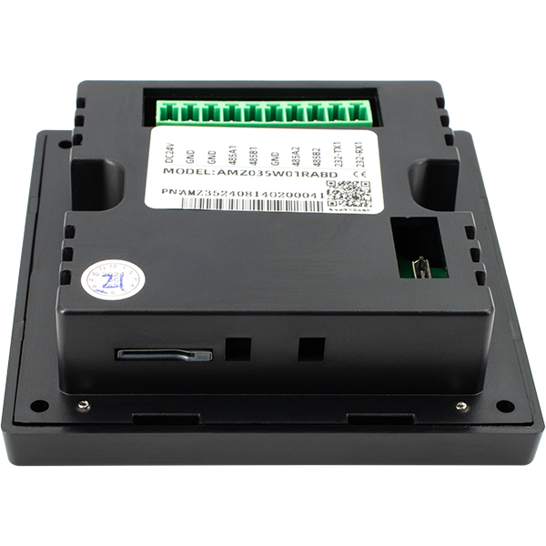 AMZ系列,3.5寸,DC10-30V,雙串口:串口1:RS232/RS485;串口2:RS485,128Mbyte SPI Nand,電阻觸摸,黑色外殼 |